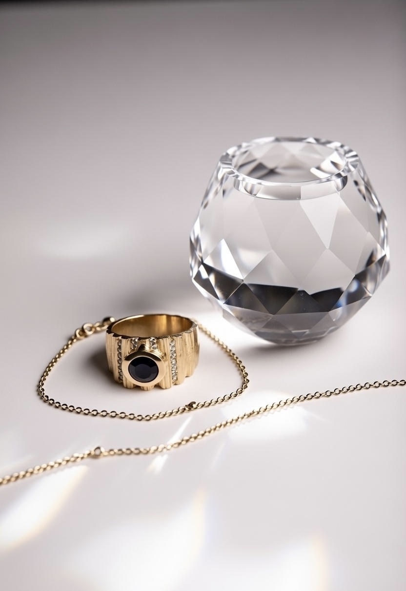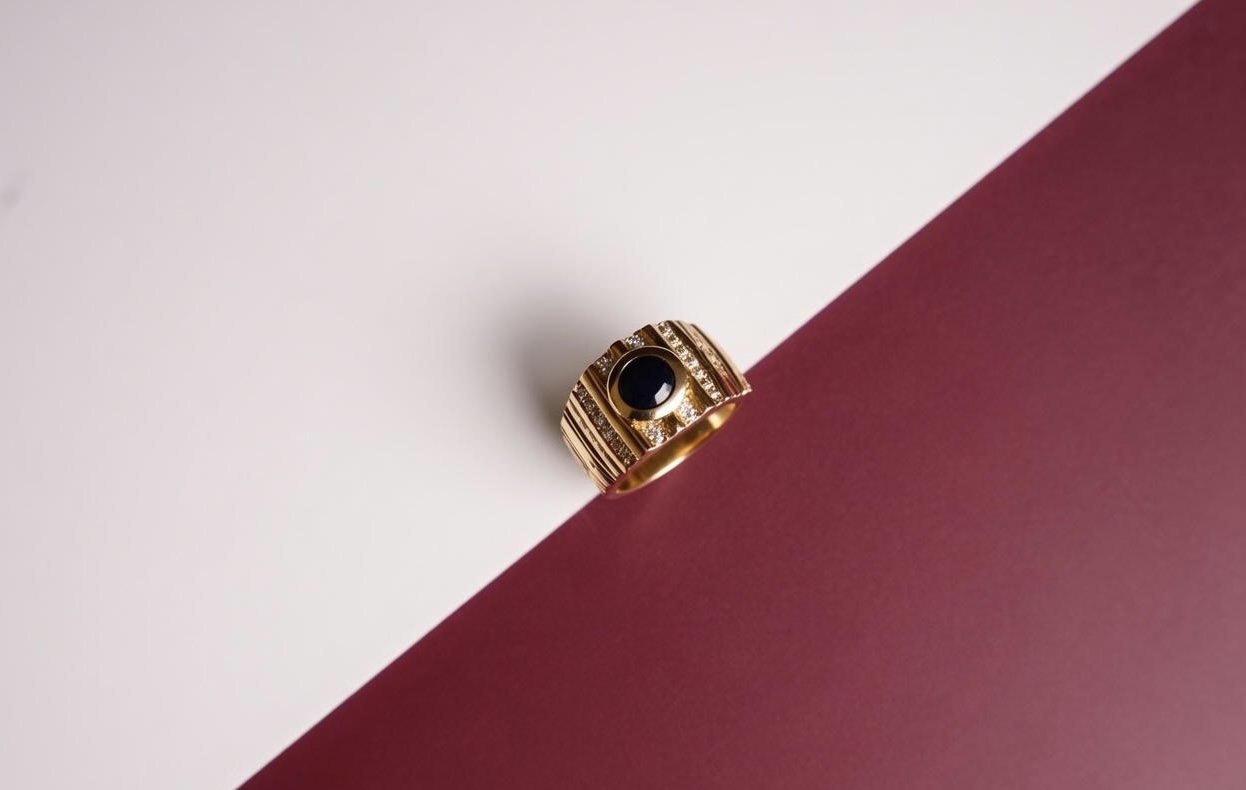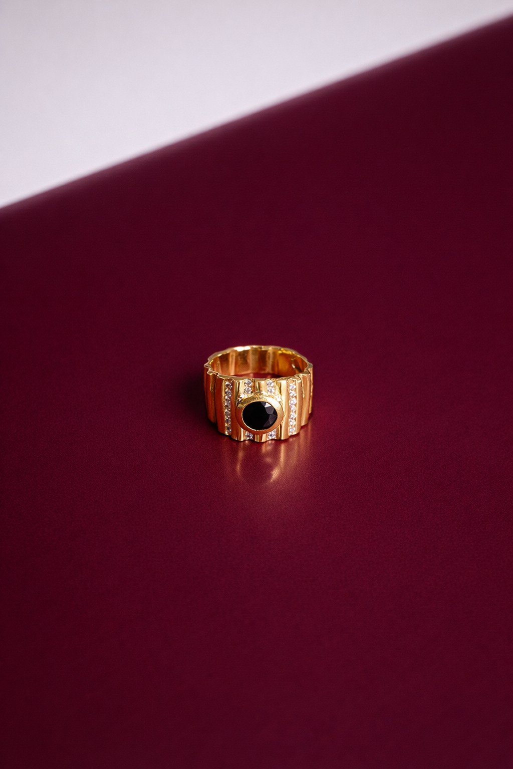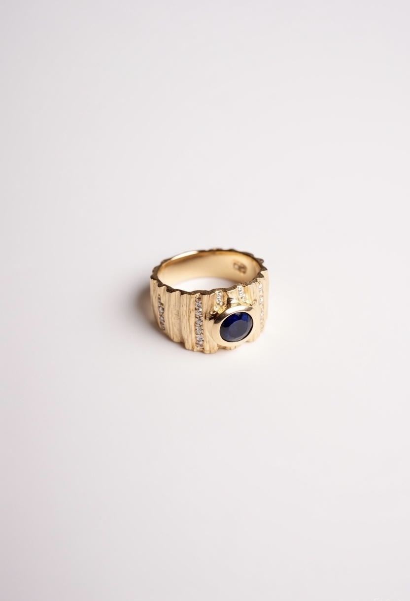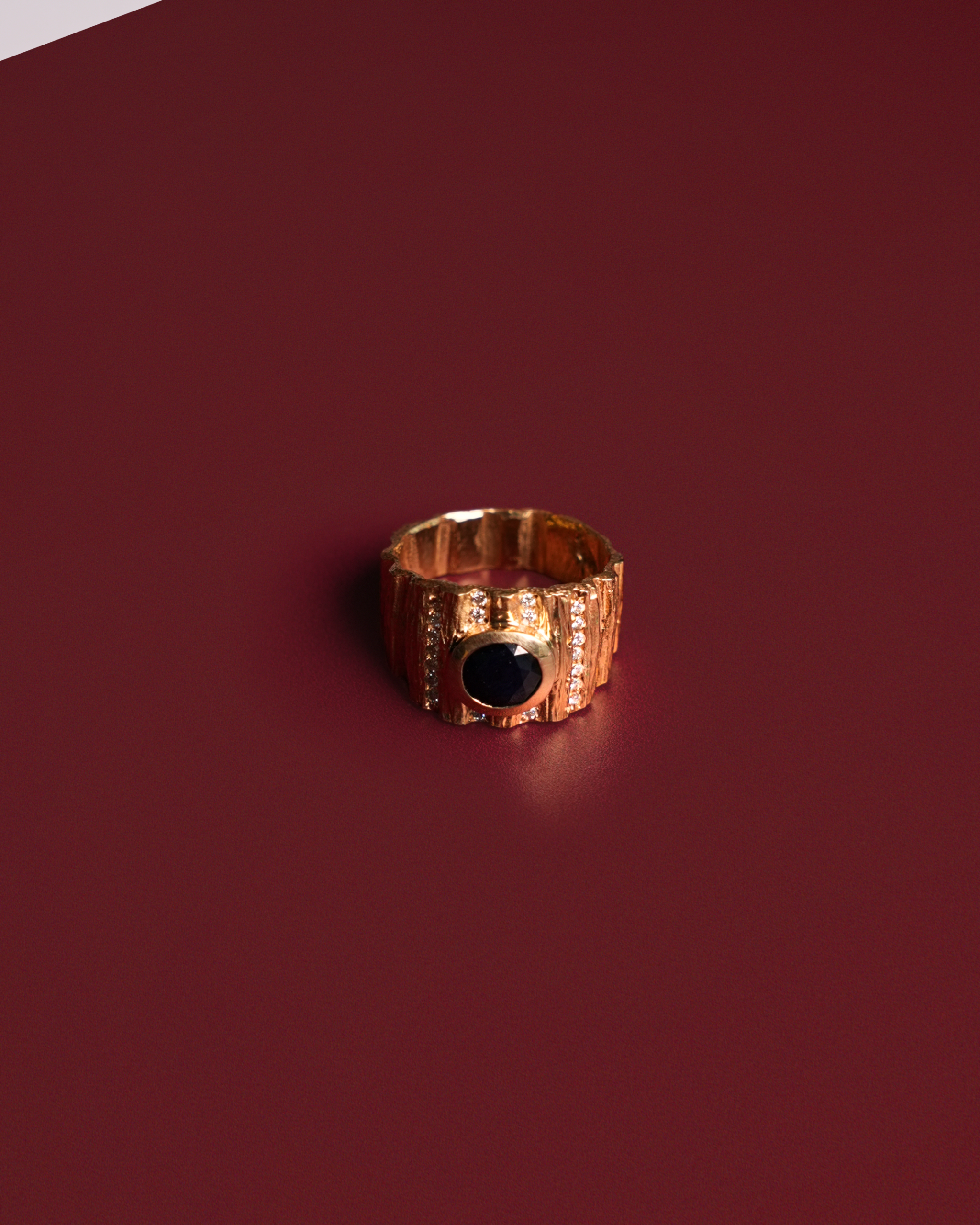 Benzersiz, organik “ağaç kabuğu” dokusuna sahip geniş bir bantla dikkat çeken cesur bir ifade parçası. Yüzük, lüks bir kontrast için küçük pırlanta sıralarıyla çevrili, çerçeve montajlı derin mavi safirle süslenmiştir.