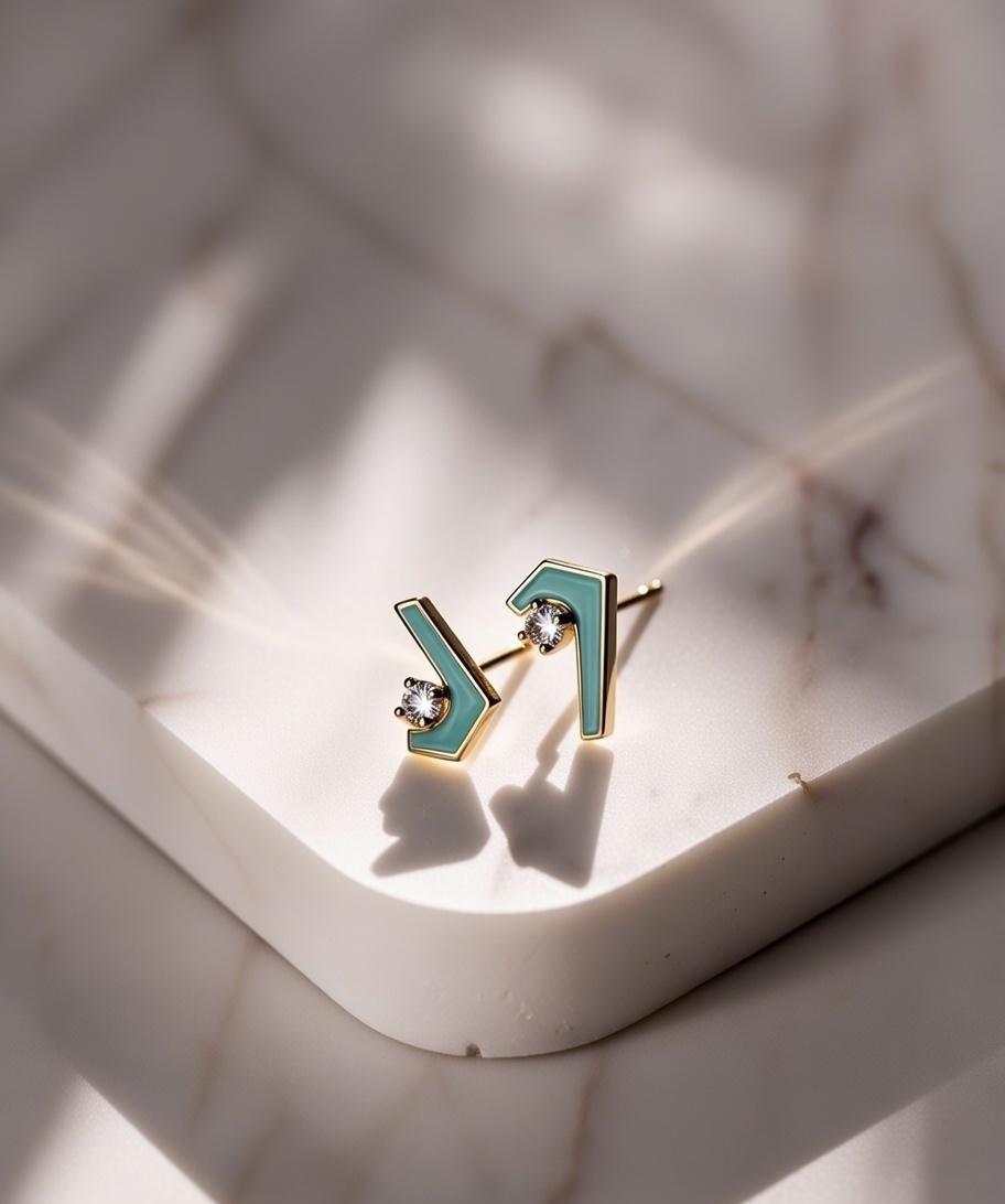 Mimari zarafet canlı renklerle buluşuyor. Bu küpeler, turkuaz emaye ve tek taş pırlantalarla süslenmiş benzersiz açılı bir tasarıma sahiptir. Günlük stilinize renk ve sofistikelik katmak için mükemmel.